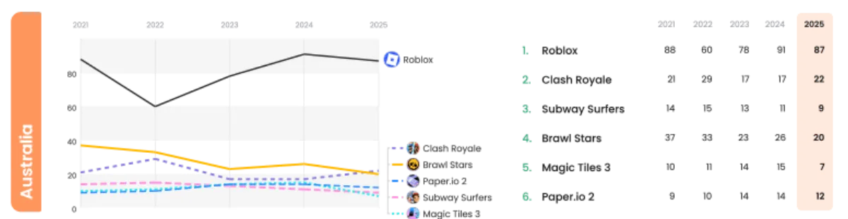 Qustodio's Australia figures show particularly high engagement with Roblox, a platform built around user-created games and shared play. Australian children spent more time on Roblox on mobile devices than children in any other market covered by the study.