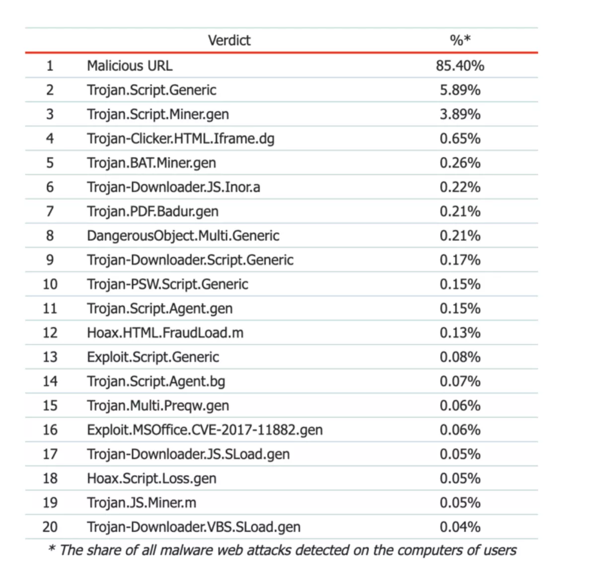 Eighty five percent of web threats were detected as malicious URL – this detection name is used to identify links from Kaspersky's black list. It includes links to web pages containing redirects to exploits, sites with exploits and other malicious programs, botnet command and control centers, extortion websites, and others.