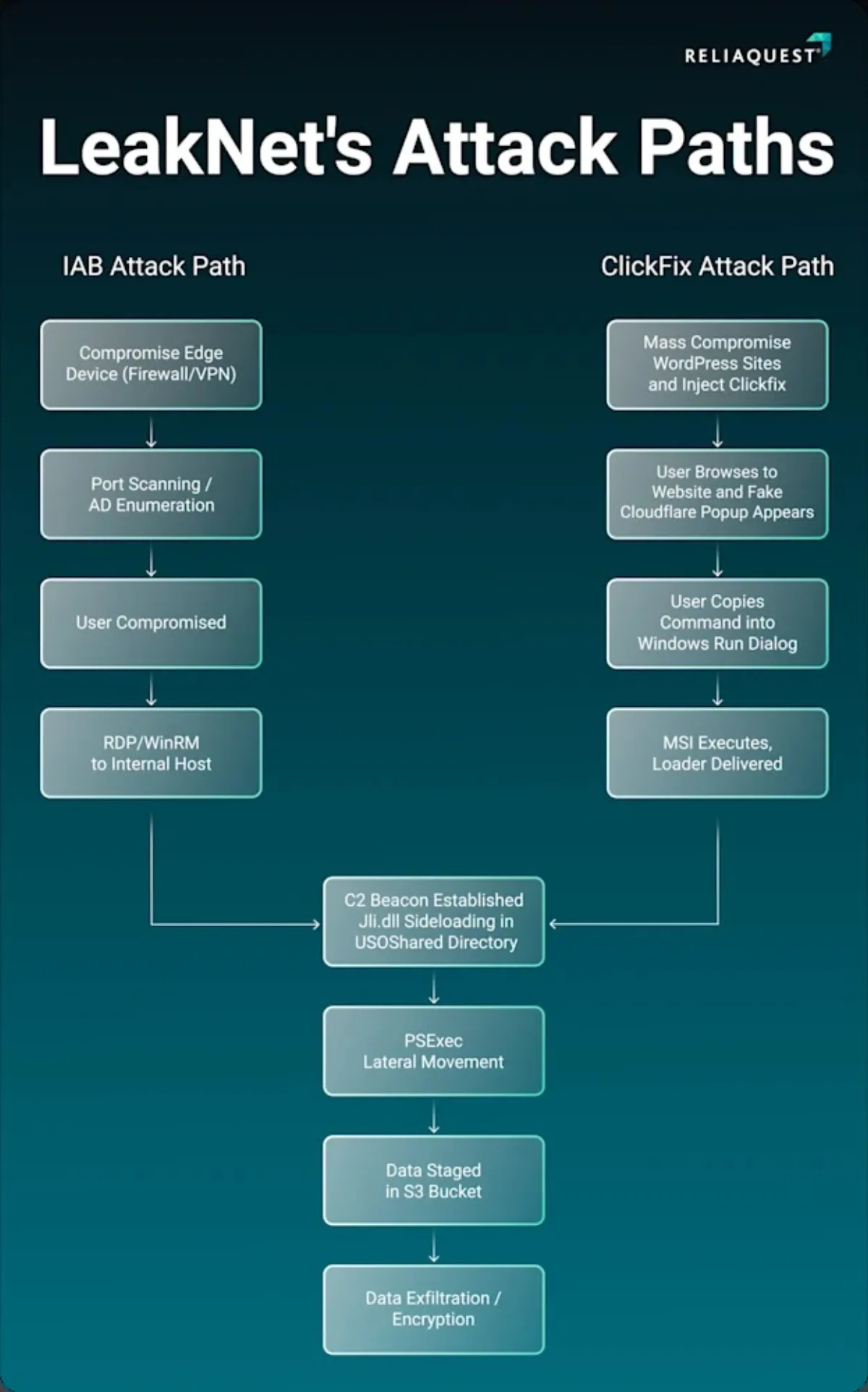 Despite the changing entry points, ReliaQuest observed a consistent post-exploitation chain in every confirmed LeakNet incident. It included jli.dll side-loading into Java in the USOShared directory, PsExec-based lateral movement and payload staging in Amazon S3 buckets.